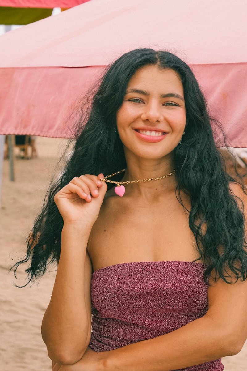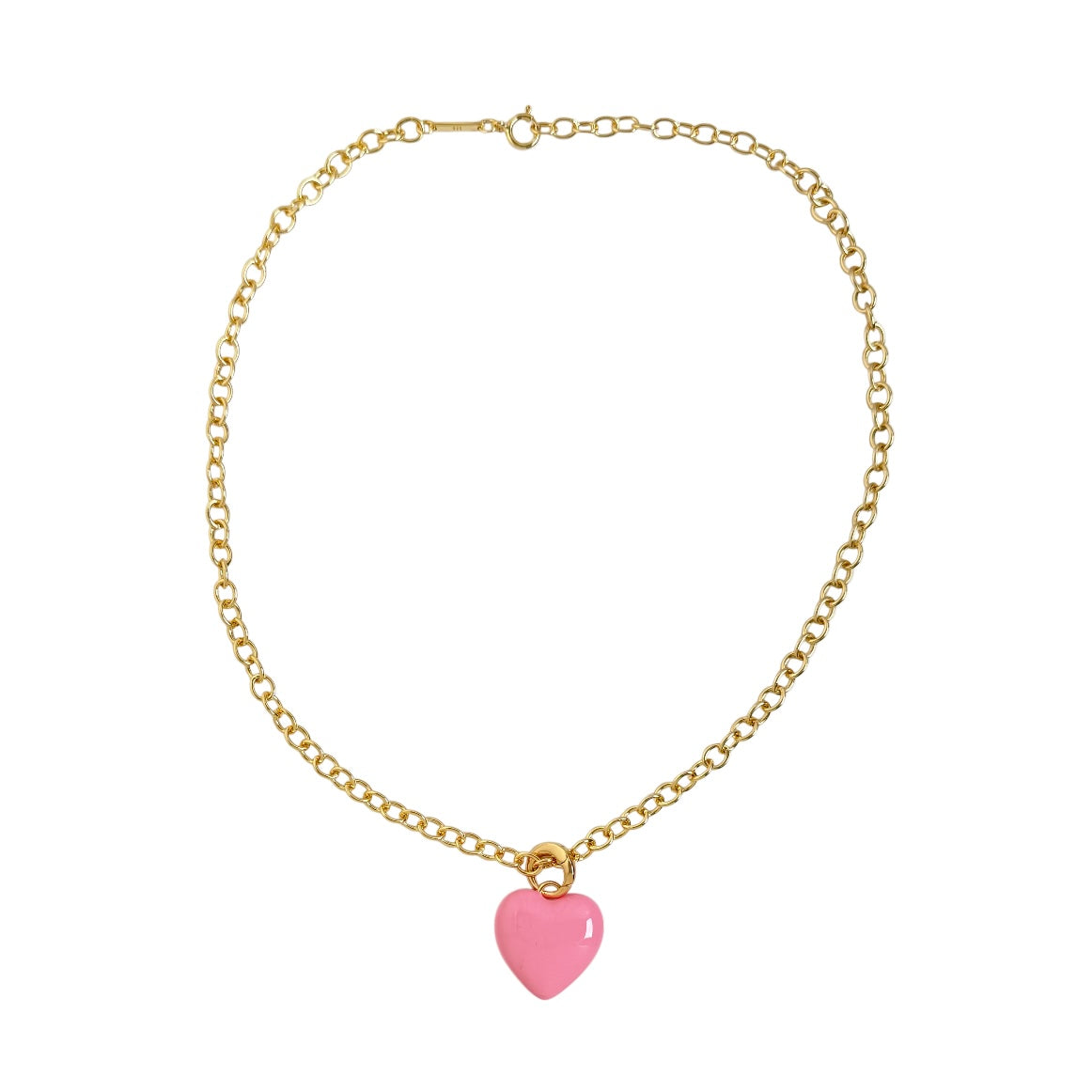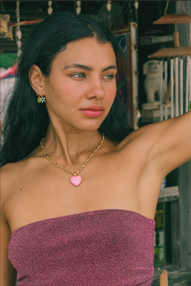 Your go to necklace. Cool chain paired with pink heart, a sweet pop of colour that instantly lifts any look.