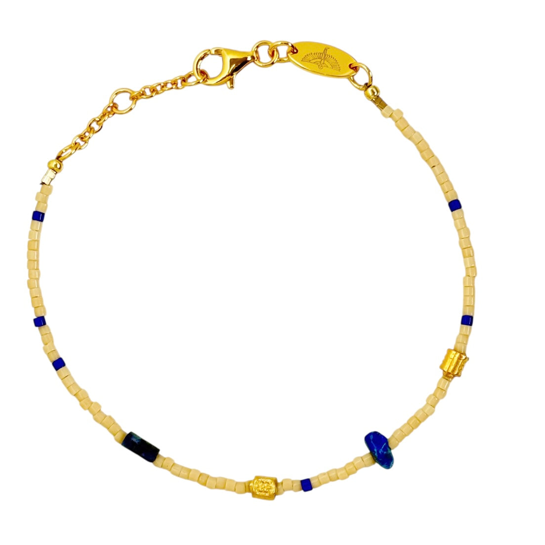 A breezy summer bracelet featuring soft beige and rich lapis lazuli beads. Lightweight and effortless, adds a touch of natural elegance to any stack or solo look.